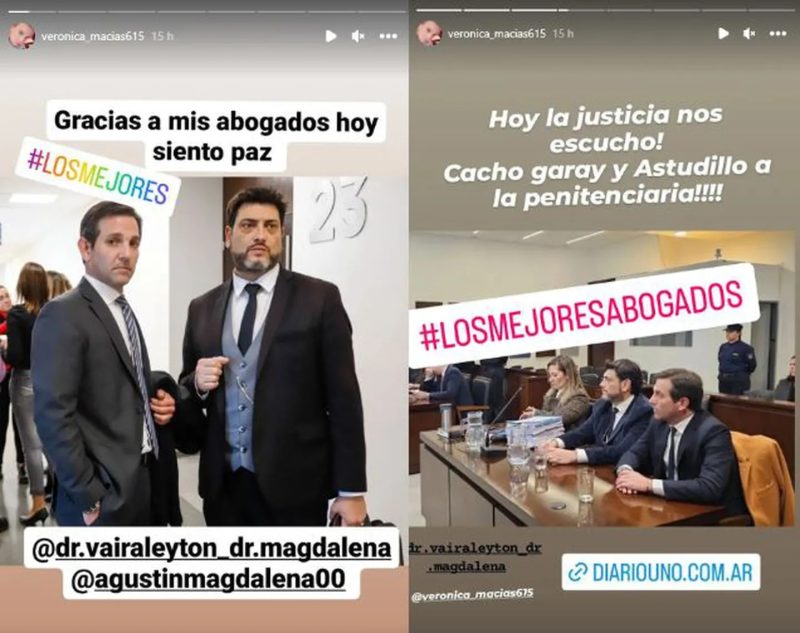 Al ver que luego de varios meses Cacho Garay iba a ir preso, Verónica Macías, su exmujer y quien lo denunció, compartió varios posteos en su cuenta de Instagram. “Hoy la Justicia nos escuchó. Gracias a mis abogados, hoy siento paz”, escribió la mujer a través de sus historias de Instagram para agradecerles a los letrados que llevaron adelante su causa.
