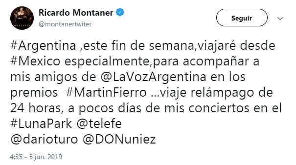 El próximo domingo 9 se realizará una nueva edición de los premios Martín Fierro, a través de la pantalla de Telefé. Entre los ciclos y ficciones nominados, se encuentra “La Voz Argentina” como mejor programa de entretenimiento. Tras enterarse de la nominación del ciclo, Ricardo Montaner, exjurado junto a Sole Pastorutti, Tini Stoessel y Axel, decidió asistir a la ceremonia a pesar que se encuentre en México formando parte de “La Voz México”.