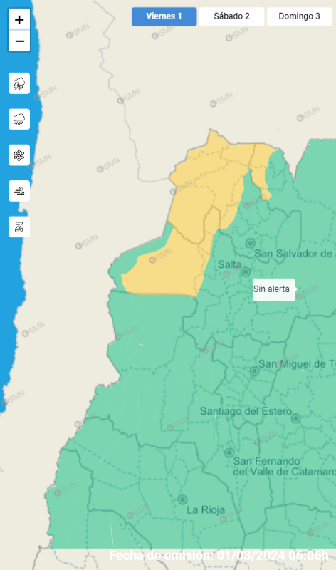 También rige alerta por tormenta en localidades del oeste de Salta y Jujuy y del este de Río Negro y Chubut, donde se esperan valores de precipitación acumulada entre 20 y 40 milímetros.