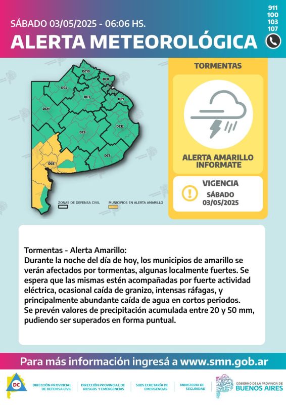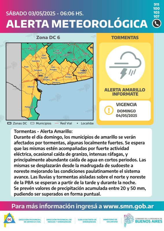 El municipio de Bahía Blanca informó que “entre la noche del sábado y durante el domingo, un frente frío atravesará la provincia, desplazándose de sudoeste a noreste, y generando lluvias y tormentas de variada intensidad”.