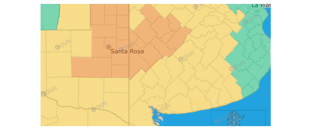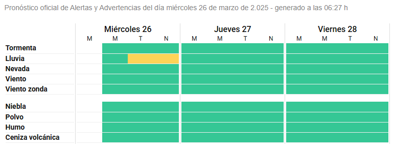 “El área será afectada por lluvias, algunas localmente intensas con valores de precipitación acumulada entre 15 y 40 milímetros, pudiendo ser superados en forma puntual. No se descarta la probabilidad de algunas tormentas embebidas en áreas de lluvias”, señala el reporte de las 6:27 de este miércoles.