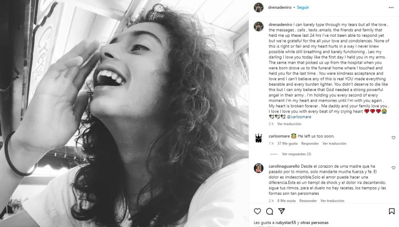 La triste noticia se había hecho pública más temprano en una publicación de Drena De Niro, la mamá del joven. “Mi hermoso y dulce ángel. Te amé más allá de las palabras o la descripción desde el momento en que te sentí en mi vientre. Fuiste mi alegría, mi corazón y todo lo que fue siempre puro y real en mi vida”, escribió la mujer.