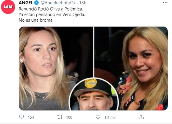 “Renunció Rocío Oliva a Polémica. Ya están pensando en Vero Ojeda. No es una broma”, anunció el conductor de “LAM” en su cuenta de Twitter.