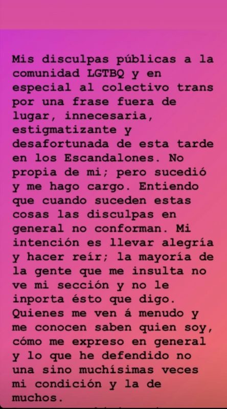 Además, el periodista realizó un pedido de disculpas más extenso en sus historias de Instagram: “Mis disculpas públicas a la comunidad LGBTQ y en especial al colectivo trans por una frase fuera de lugar, innecesaria, estigmatizante y desafortunada de esta tarde en los Escandalones. No propia de mí, pero sucedió y me hago cargo“.