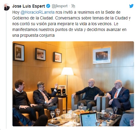 “Gracias José Luis Espert por el apoyo. Sabemos que tenemos que continuar con las grandes transformaciones que ya iniciamos. Estoy seguro que junto a todos los vecinos podemos seguir haciendo de Buenos Aires un gran lugar para vivir”, declaró Larreta.