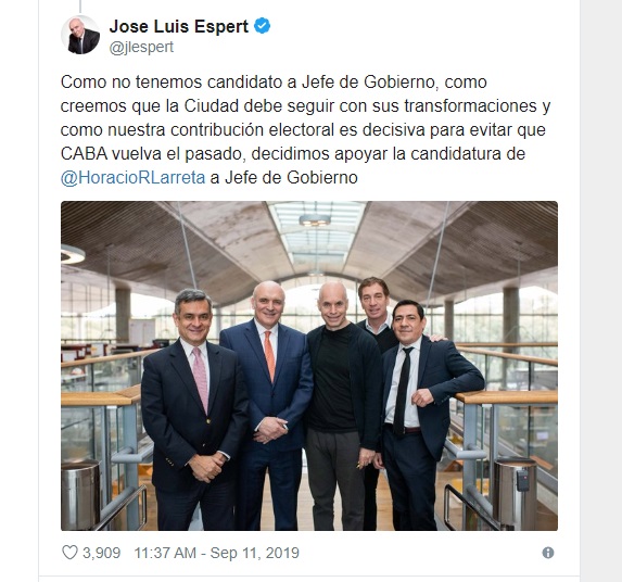 “Como no tenemos candidato a jefe de Gobierno, como creemos que la ciudad debe seguir con sus transformaciones y como nuestra contribución electoral es decisiva para evitar que CABA vuelva el pasado, decidimos apoyar la candidatura de Horacio Rodríguez Larreta a Jefe de Gobierno”, anunció Espert en Twitter.