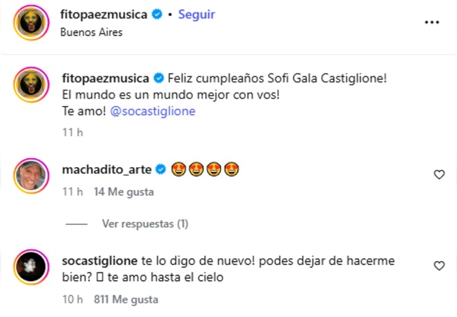 “Feliz cumpleaños Sofi Gala Castiglione. El mundo es un mundo mejor con vos. Te amo”, escribió Páez.
