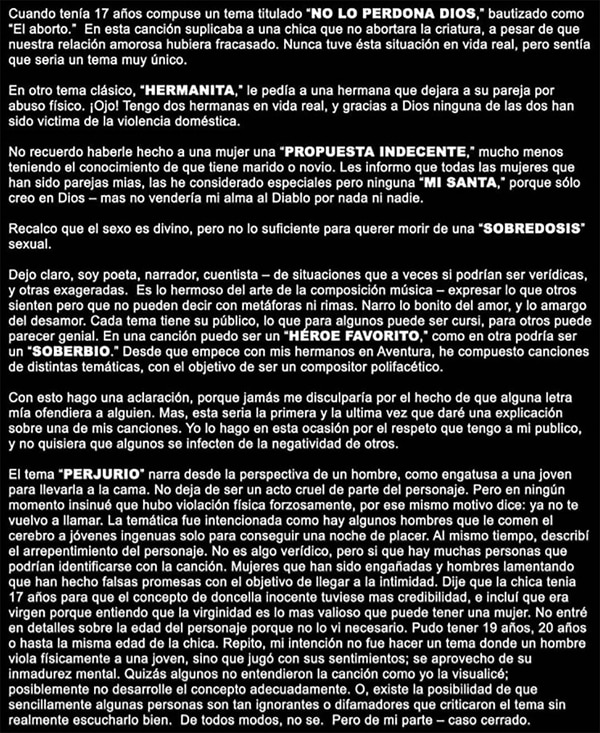 “Jamás me disculparía por el hecho de que alguna letra ofendiera a alguien. Más, estar sería la primera y la última vez que daré una explicación sobre una de mis canciones. Yo lo hago en esta ocasión por el respeto que tengo a mi público, y no quisiera que algunos se infecten de la negatividad de otros”, señaló el artista.