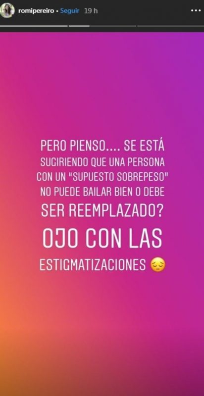Y agregó, en una segunda publicación: “Pero pienso… ¿se está sugiriendo que una persona con ‘supuesto sobrepeso’ no puede bailar bien o ser reemplazado? Ojo con las estigmatizaciones”.
