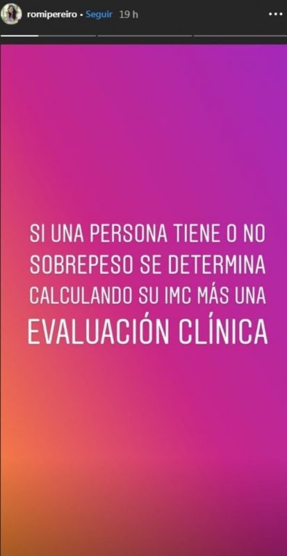 “Si una persona tiene o no sobrepeso se determina calculando su IMC (Índice de Masa Corporal) más una evaluación clínica”, comenzó explicando la licenciada en Nutrición en sus historias de Instagram.