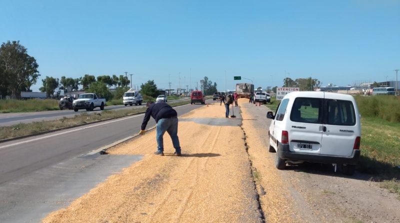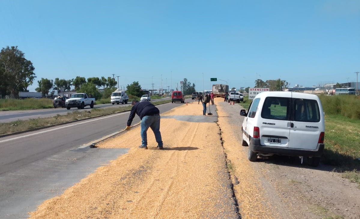 Un camión que transitaba por la ruta 3, a la altura de la rotonda de Pedro Pico, perdió parte de la carga de maíz que llevaba.