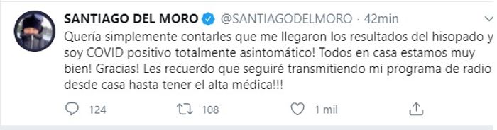 “Quería simplemente contarles que me llegaron los resultados del hisopado y soy COVID positivo totalmente asintomático!”, indicaba Del Moro.