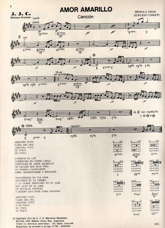 Amor amarillo contó con 10 temas y, en la primera y tercera edición, se incluyó la canción Torteval. Además, en ese álbum Gustavo le hizo un homenaje a Luis Alberto Spinetta -su referente musical- al grabar una versión muy recordada de Bajan, uno de los clásicos del disco Artaud de 1973.