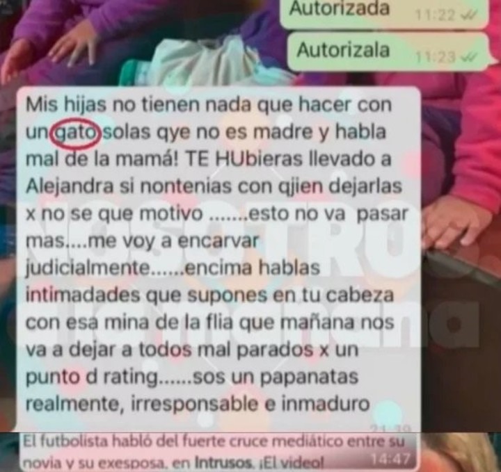 Después de ese tremendo mensaje, Nicole volvió a la carga con otro cuestionamiento hacia la pareja de su ex. “Mis hijas no tienen nada que hacer con un gato solas que no es madre y habla mal de la mamá… esto no va a pasar más, me voy a encargar judicialmente…”.