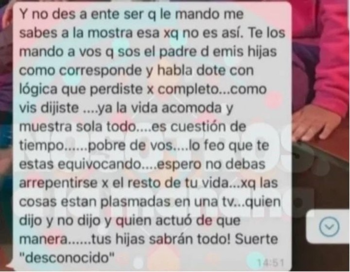 “Pobre de vos, lo feo que te estás equivocando, espero no debas arrepentirte por el resto de tu vida porque las cosas están plasmadas en una tv, quien dijo y no dijo y quien actuó de qué manera… ¡tus hijas sabrán todo! Suerte ‘desconocido'”, se despidió Nicole. (Clarín)