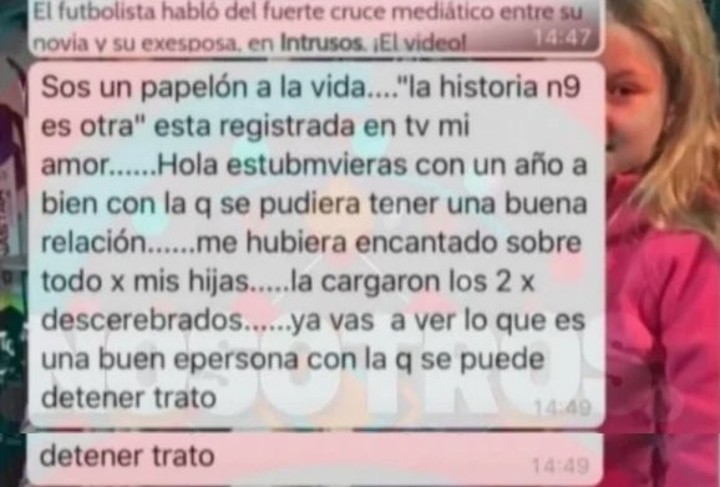 “La cagaron los dos por descerebrados… ya vas a ver lo que es una buena persona con la que se puede tener trato”, expresó Nicole al final de ese chat. En tanto, en una quinta y última captura se lee: “Y no des a entender que le mando mensajes a la mostra esa porque no es así. Te los mando a vos que sos el padre de mis hijas y hablá con lógica”.