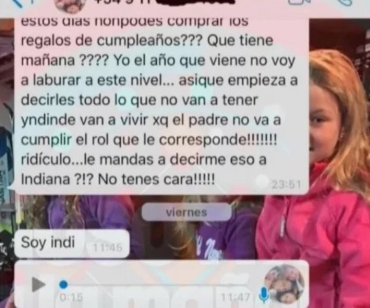 ¿Pero cuál es el contenido de esos mensajes que desataron esta nueva guerra mediática entre la ex pareja? El primer chat que se viralizó es uno de la panelista de Cortá por Lozano recriminándole a su ex su compromiso para con Indiana, Allegra y Sienna, las hijas que tienen en común.