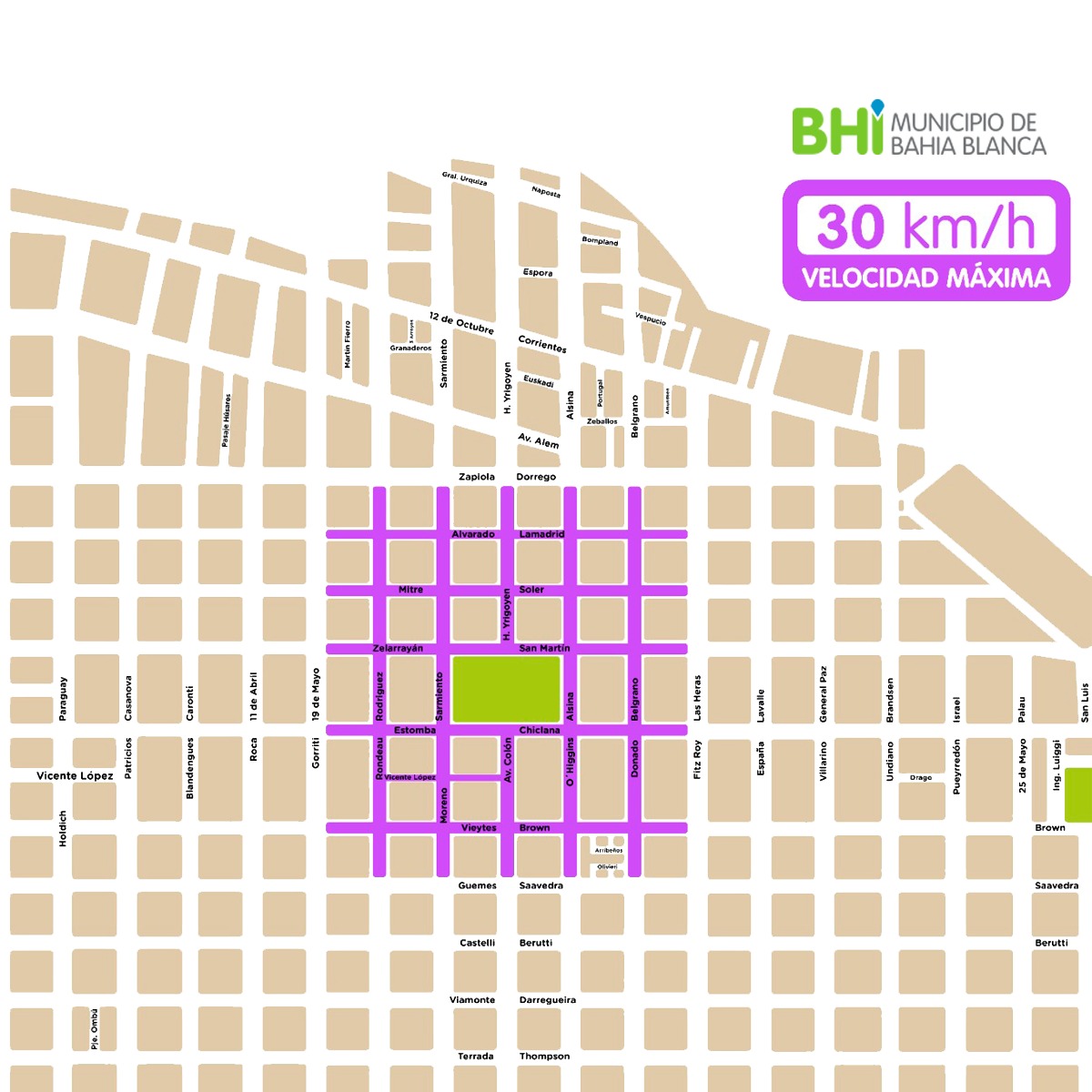 En todo el mundo se planteó como eje la reducción de la velocidad de circulación en las calles urbanas, que en Bahía Blanca será para la zona delimitada por el cuadrante 19 de Mayo-Gorriti, Zapiola-Darregueira, Las Heras-Fitz Roy, Güemes-Saavedra.