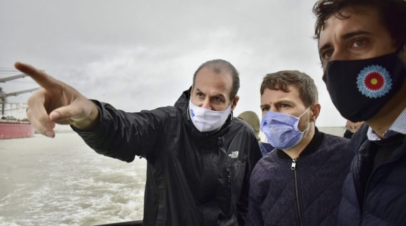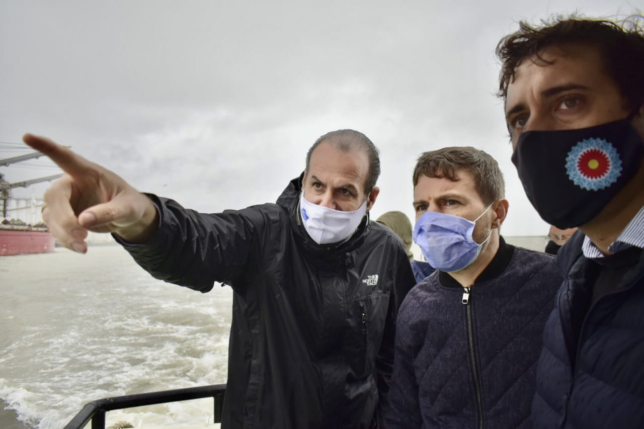 Costa y el equipo de trabajo del Ministerio bonaerense en su paso por el Puerto y previamente a la rueda de prensa realizaron una navegación por el estuario local junto a Federico Susbielles y autoridades del Consorcio.