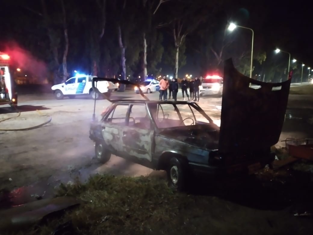 Se detalló que efectivos policiales engancharon el automóvil con una eslinga y lo sacaron hasta la vía pública, lo que permitió que el fuego no se propagara hacia el domicilio.