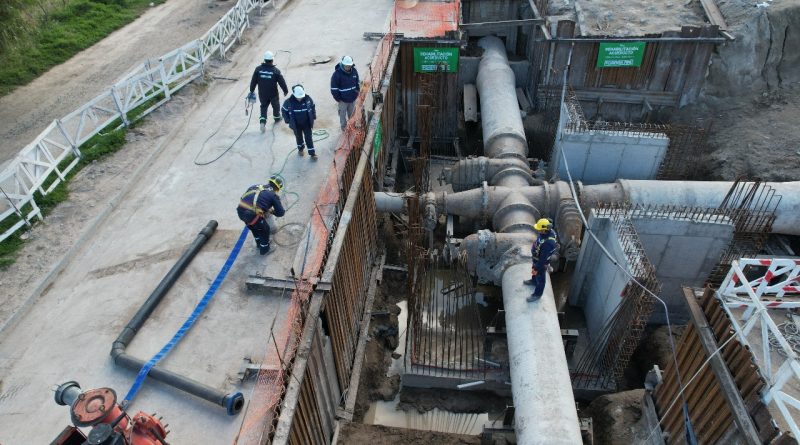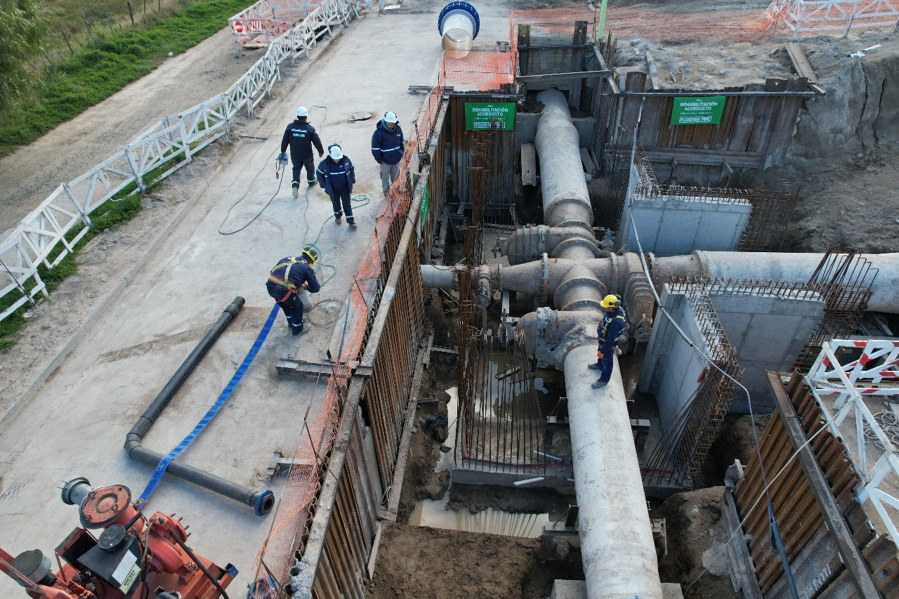 En el sector de trabajo ya se realizó el reemplazo de las grandes válvulas y la construcción de cámaras, por lo que esta instancia de envainado de la cañería es el último paso de la intervención sobre el conducto.