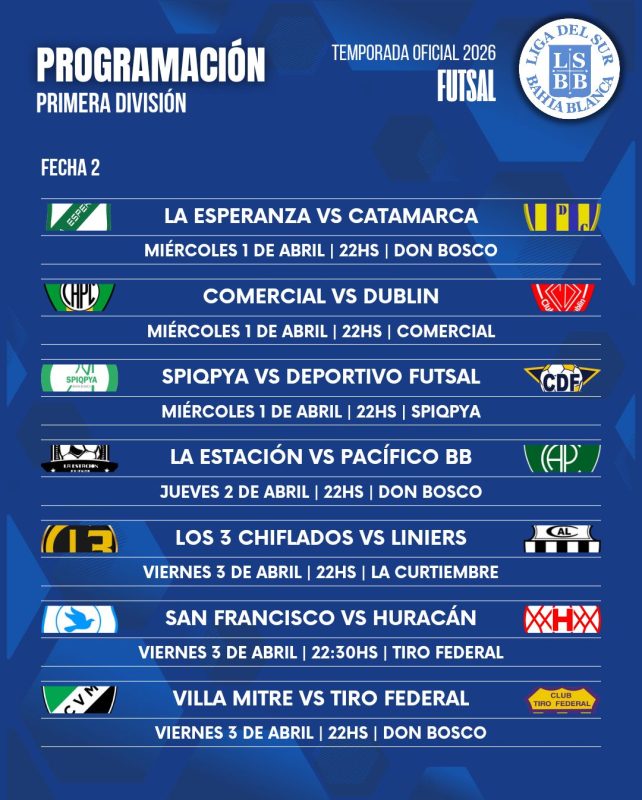 La Liga del Sur informó la programación correspondiente a la fecha 2 del Torneo Apertura de Primera División del Futsal.