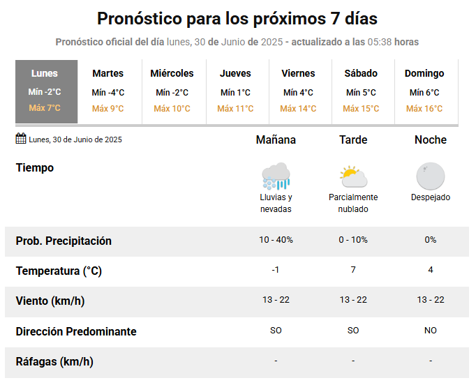En tanto, para el martes se anticipó una máxima de 9° y una mínima de -4°, con cielo algo nublado y algo de viento del sector oeste.