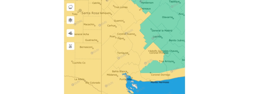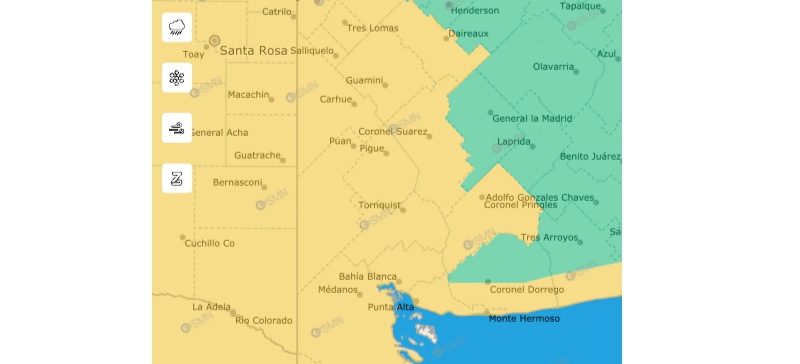 El área será afectada por vientos del sector sur con velocidades entre 30 y 45 km/h y ráfagas que pueden alcanzar los 80 km/h.