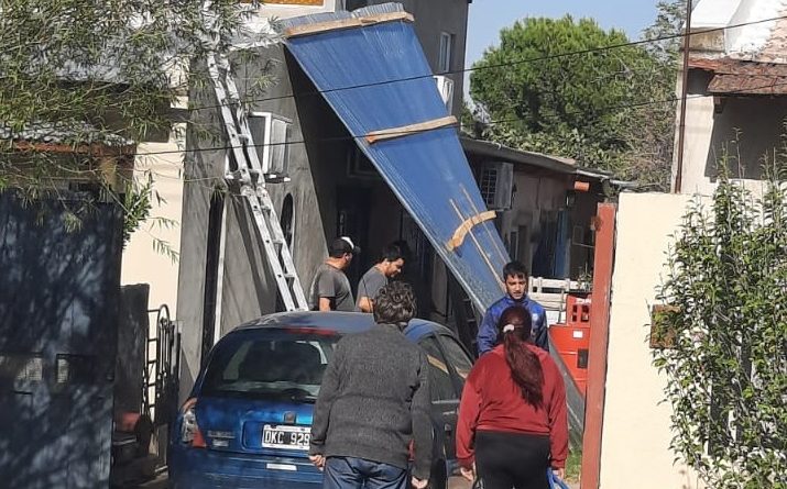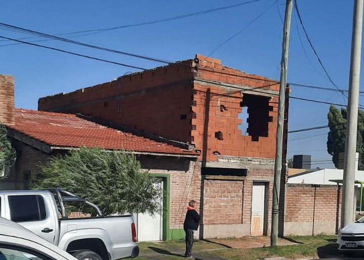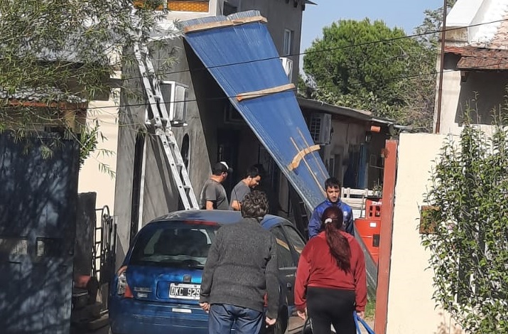 El viento intenso que se registra en la ciudad provocó la voladura de chapas de una vivienda en construcción ubicada en La Falda y De Angelis.
