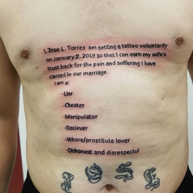 “Yo, José L. Torres me hago un tatuaje voluntariamente el 2 de enero de 2019 para poder ganarme la confianza de mi mujer por el dolor y el sufrimiento que he causado a nuestro matrimonio”, se lee en la primera parte de la nota —escrita en inglés—, que va desde los pectorales hasta casi el ombligo.