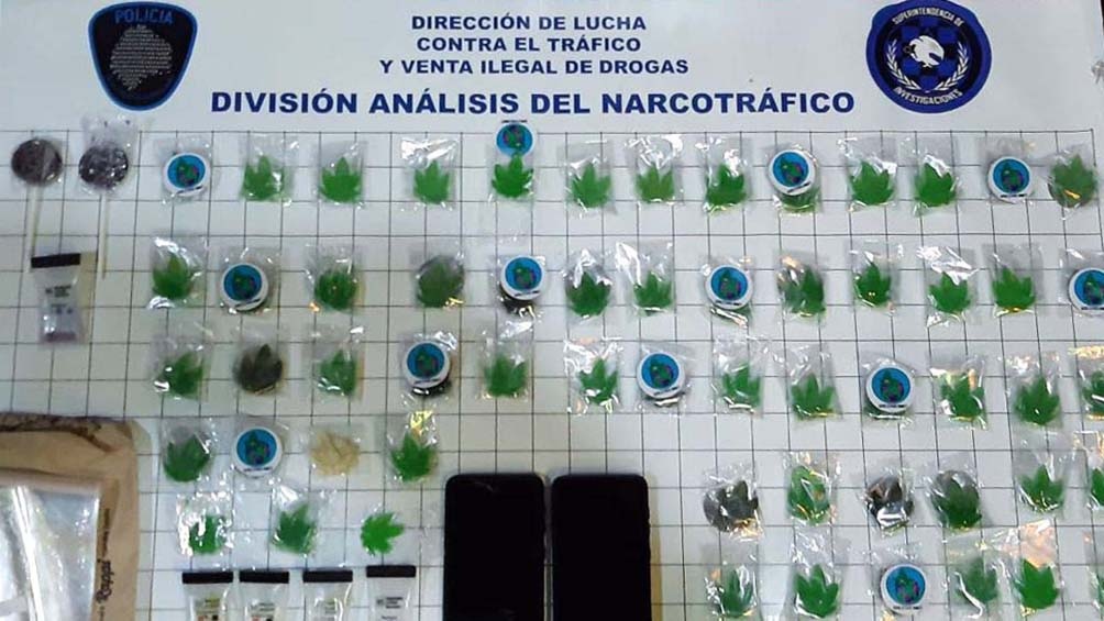 Allí fueron detenidos dos hombres que tenían en su poder una bolsa de papel madera con varios paquetes de caramelos masticables gelatinosos, de color verde y con forma de hojas de marihuana.