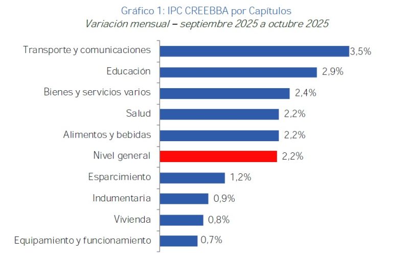 Durante el mes de octubre, el mayor aumento a nivel capítulos se dio en Transporte y comunicaciones, el cual registró un crecimiento del 3,5% como consecuencia de variaciones en automóviles (5,6%), combustibles y lubricantes (4,7%) y seguros, estacionamiento y otros servicios (4,4%) por citar los de mayor importancia.