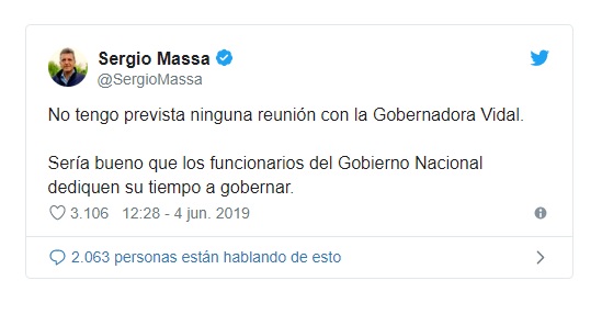 “No tengo prevista ninguna reunión con la Gobernadora Vidal. Sería bueno que los funcionarios del Gobierno Nacional dediquen su tiempo a gobernar”, escribió Massa en su cuenta personal de Twitter.
