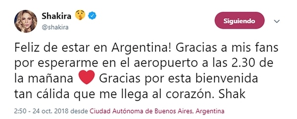“¡Feliz de estar en Argentina!“, expresó Shakira en su cuenta de Twitter este martes 24. “Gracias a mis fans por esperarme en el aeropuerto a las 2.30 de la mañana. Gracias por esta bienvenida tan cálida que me llega al corazón“, señaló muy emocionada.