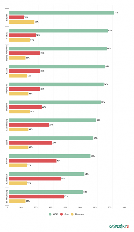 Denis Legezo, investigador principal de seguridad de Kaspersky, dijo que “a pesar de que aproximadamente dos tercios de todos los puntos de acceso existentes en las ciudades sede del Mundial utilizan cifrado basado en la familia más segura de protocolos de acceso protegido wifi (WPA/WPA2), estos puntos de acceso no pueden siquiera considerarse seguros si la contraseña es visible a todos”.