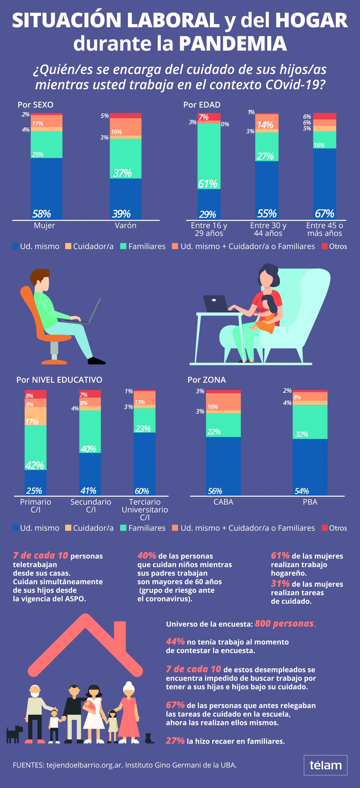 Siete de cada diez personas (73%) que teletrabajan desde sus casas cuidan simultáneamente de sus hijas e hijos desde la vigencia del aislamiento social en Ciudad y Provincia de Buenos Aires, lo que plantea “una encerrona” de cara a la paulatina flexibilización de la cuarentena que por ahora no incluye la reapertura de las escuelas, según un estudio realizado por la organización “Tejiendo el barrio” y el Instituto Gino Germani de la UBA.