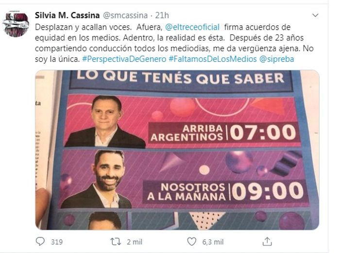 “Cuando hice un reclamo porque me estaban recortando tareas habituales del noticiero, participación y reportajes que, por contenido, solía hacer. Pero estalló el 1 de julio (de este año), cuando salió en Clarín un aviso con la programación de la mañana de El Trece, solo con figuras masculinas, donde claramente me dejaban afuera como co conductora“, indicó en una entrevista.