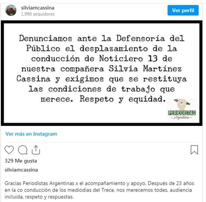 Silvina es delegada gremial de Sipreba y ella considera que su apartamiento tuvo que ver también con su actividad sindical. Además, la comunicadora es una ferviente militante de la lucha feminista y del aborto legal.