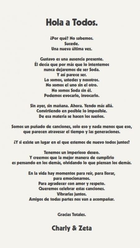 “Tenemos un imperioso deseo. Y creemos que la mejor manera de cumplirlo es pensando en los demás, olvidando lo que piensan los demás. En la vida hay momentos para reír, para llorar, para emocionarnos. Para agradecer con amor y respeto. Queremos celebrar estas canciones. Vibrarlas juntos. Amigos de todas partes nos van a acompañar. Gracias totales”, completó el comunicado.