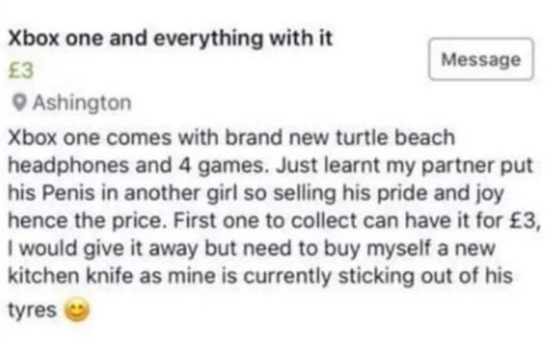 De este modo, Georgia compartió una foto de la consola de videojuegos de su marido en una página de Facebook donde los usuarios venden sus pertenencias. El irresistible posteo aclaraba: “Viene con auriculares nuevos y con 4 juegos. Me acabo de enterar que mi novio mantuvo relaciones con otra chica, así que estoy vendiendo su orgullo y su alegría. El primero que venga a buscarla se le lleva por 3 libras ($146). La regalaría, pero necesito comprarme un cuchillo nuevo, ya que el mío se está quedando sin filo”.