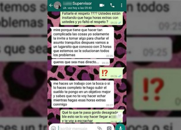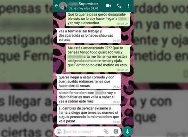 El amigo de la agredida asegura que la victima perdió el trabajo y que la empresa “tapa todo”, que el dueño de la misma hace caso omiso a varias denuncias que pesan sobre el supervisor, que mantiene su situación con total normalidad. Entonces, decidió hacer pública la conversación.