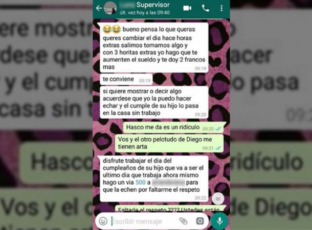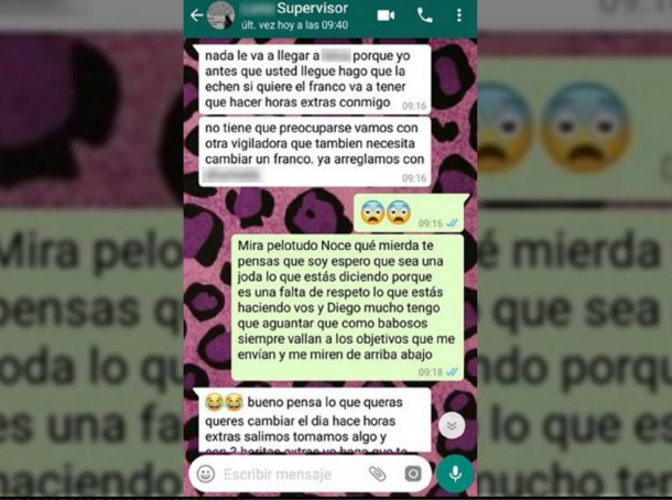 La conversación fue compartida por un amigo la victima quien compartió los mensajes en un grupo de Facebook. El joven asegura que la mujer, que hasta ese momento trabajaba en una empresa de seguridad mendocina, sufrió acoso y constantes amenazas por parte de su supervisor, tal como se observa en las capturas.
