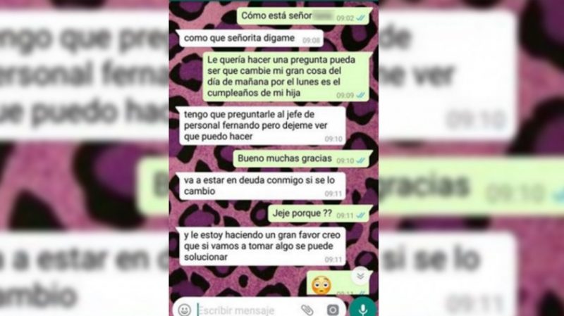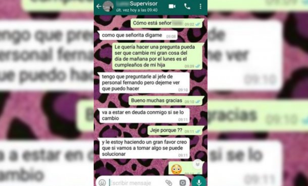 En los chat se puede leer que la mujer le pide al supervisor un cambio de turno para poder estar en el cumpleaños de su hija. Ante esto, el hombre le dice que sí, pero a cambio de “horas extras” con él.