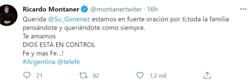 Su amigo Ricardo Montaner le mandó un sentido mensaje desde su cuenta de Twitter y rezó por ella. “Querida Susana, estamos en fuerte oración por ti, toda la familia pensándote y queriéndote como siempre. Te amamos, Dios está en control. Fe y más fe”, escribió el cantante, y de inmediato obtuvo miles de “Me gusta” de seguidores que esperan la pronta recuperación de la diva. (Infobae)