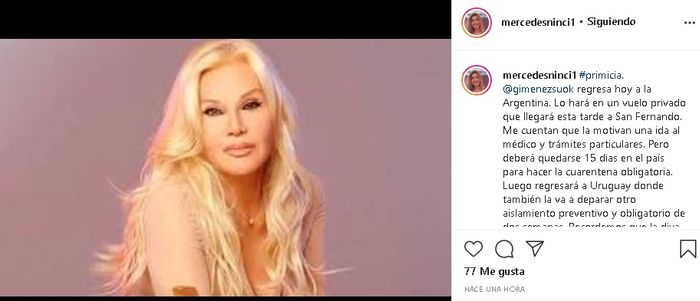 “Recordemos que la diva viajó a fines de mayo a Uruguay donde inició los trámites de radicación. Siempre se vuelve al pago!!“, cerró Ninci su información exclusiva.