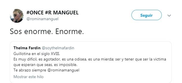 Y para concluir con su mensaje, mencionó a la periodista para manifestarle su compleyo apoyo: “Es muy difícil, es agotador, es una odisea, es una mierda; ser y tener que ser la víctima que esperan que seas, es imposible. Te abrazo siempre, @rominamanguel“.