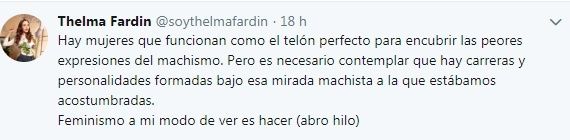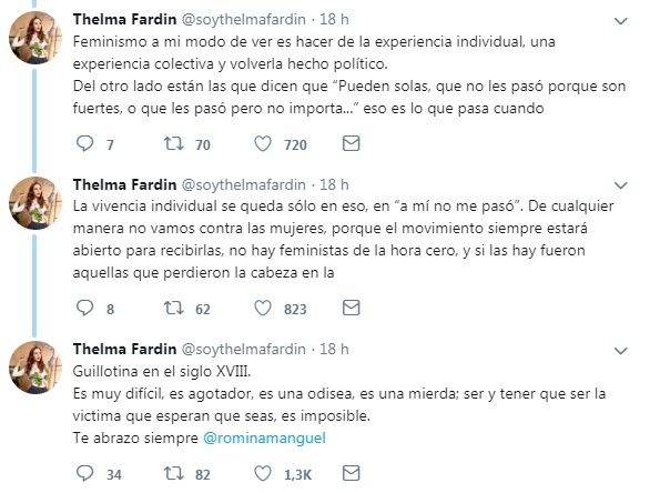 “De cualquier manera no vamos contra las mujeres, porque el movimiento siempre estará abierto para recibirlas, no hay feministas de la hora cero, y si las hay fueron aquellas que perdieron la cabeza en la guillotina en el siglo XVIII“, expresó Thelma en su cuenta de Twitter.
