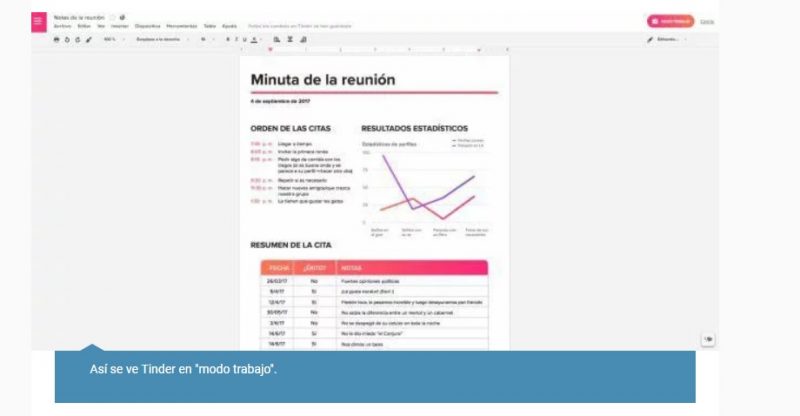 En la version para PC, la app de citas agregó un botón “modo trabajo” en el ángulo superior derecho. Con un simple click la pantalla se transforma en un aparente documento de Google Drive intitulado “Notas de la reunión”.