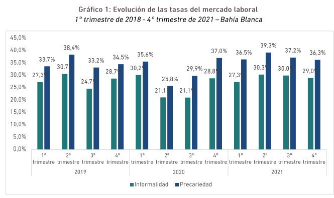 Según los datos de la Encuesta Permanente de Hogares del Indec (EPH), se estima que en Bahía Blanca la tasa de informalidad alcanzó al cierre del cuarto trimestre de 2021 el 29% (lo que equivale a aproximadamente a 29.000 personas), mientras que la tasa de precariedad se ubicó en 36,3% (aproximadamente 50.000 individuos).