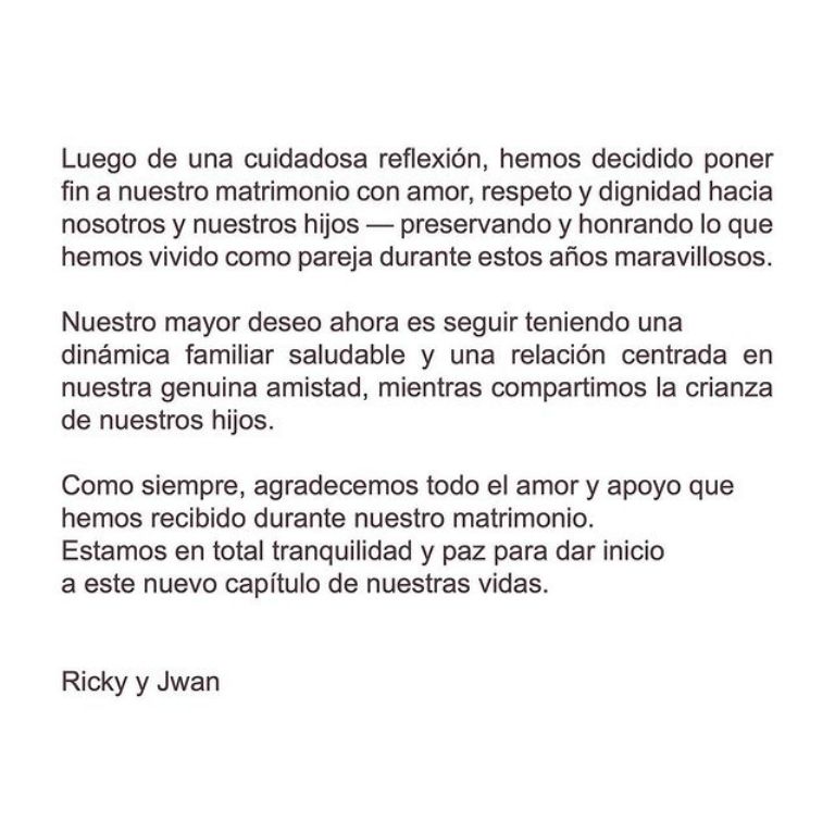“Luego de una cuidadosa reflexión, hemos decidido poner fin a su matrimonio con amor, respeto y dignidad hacia nosotros y nuestros hijos. Preservando y honrando lo que hemos vivido como pareja durante estos años maravillosos”, comienza el comunicado que el puertorriqueño subió a su Instagram.